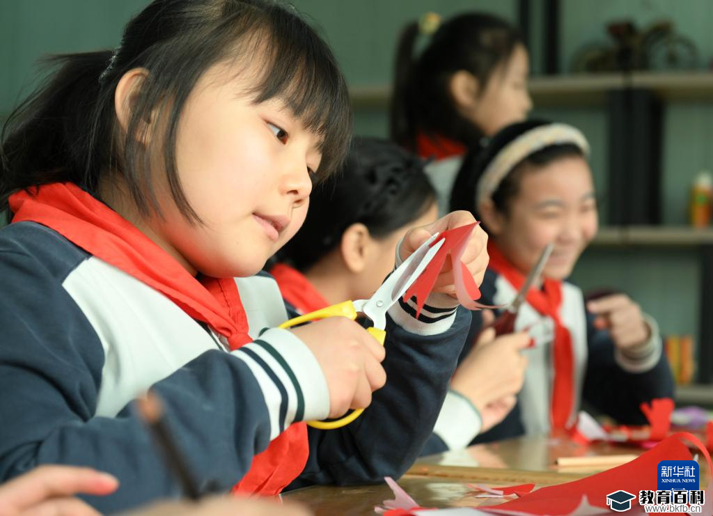 2月28日,学生在石家庄市东风小学非遗工坊学习剪纸。